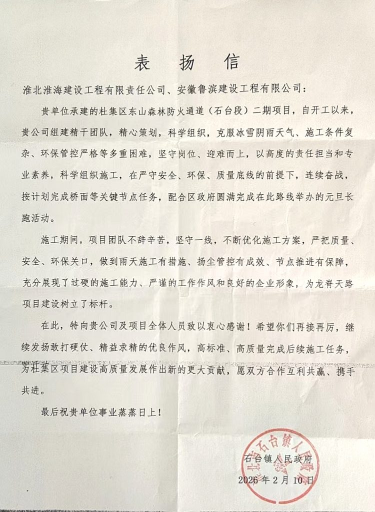 近期,寒潮频袭,但在公司承建的杜集区森林防火通道项目现场,却是一派热火朝天的施工景象。面对节前仅剩的宝贵工期,项目团队将“精细化管理”贯穿始终,做到冬季施工有措施、扬尘管控有成效、节点推进有保障,充分展现了过硬的施工能力、严谨的工作作风和良好的企业形象。近日,得到了淮北市石台镇人民政府的书面表扬。